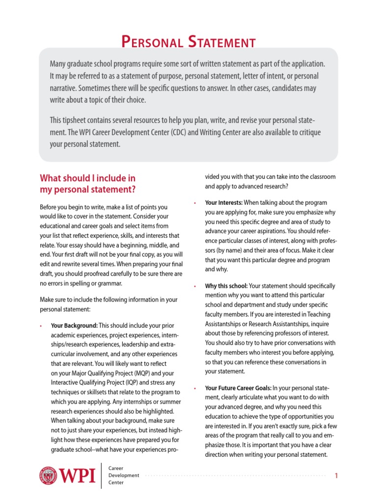 The Personal Statement Most graduate schools require a personal statement as part of your application. This statement is centered around your interest in psychology, your personal background, the reasons you are applying to that particular graduate program, and your career and personal objectives. Although a well-written statement will not overcome poor grades or low GRE scores, a You’ve picked a graduate school and a program of study. You notice that a personal statement is part of the application process and the deadline for submission is 3 months away. What do you do? Choices. a) Start right away so I can submit it as soon as possible and get it off my plate b) Wait until 2 weeks before it’s due because I work best under a looming deadline. c) Start reflecting Personal Statement vs. Statement of Intent The objective of a personal statement or statement of interest is to provide the admissions committee with a sense of who you are and your motivations aside from your transcripts and references. When faced with the task of writing a personal statement or statement of intent, students often ask
